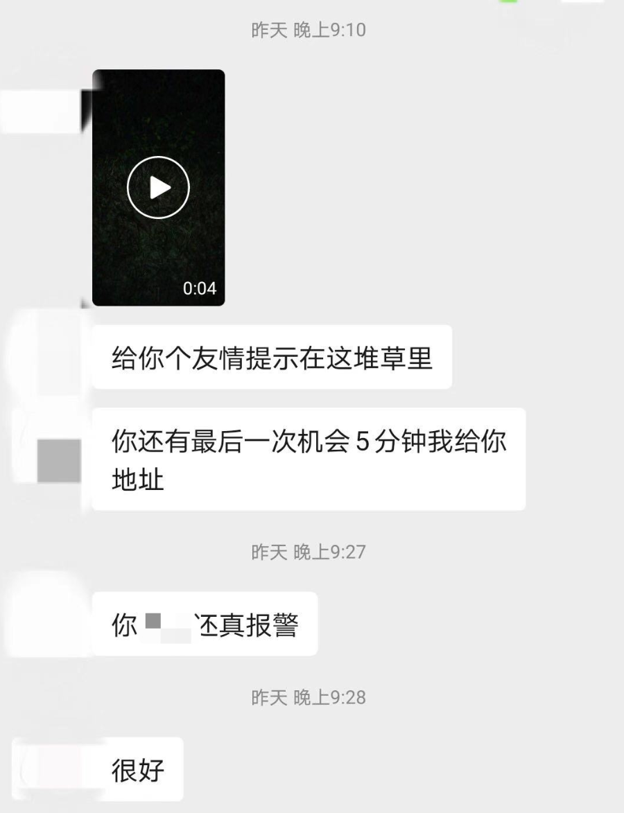 而韦女士这边还在尽量与对方周旋。没想到对方发来一段在草丛中拍摄的长达4秒的小视频,称是给韦女士的一个友情提示,再给最后一次机会必须5分钟内转钱。
