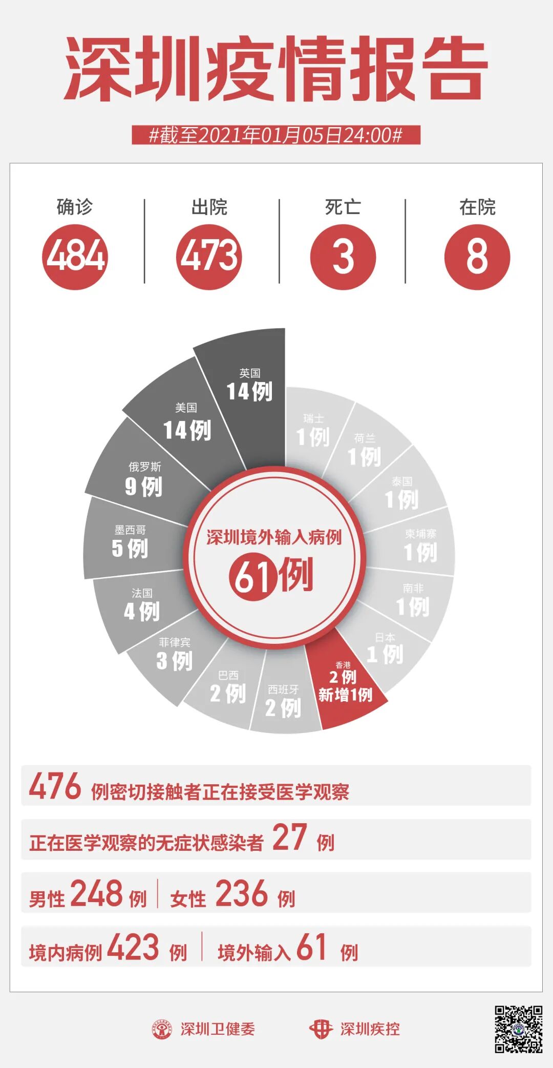 1月5日0-24时,深圳新增1例境外输入确诊病例和3例境外输入无症状感染者。