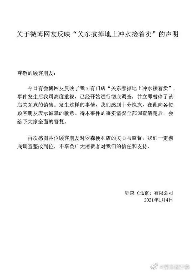 1月5日凌晨1点,罗森(北京)有限公司通过官方微博@京津冀罗森发布声明回应此事称“已经开始进行彻底调查,并立即暂停了该店关东煮的销售。待本事件的事实情况全部调查清楚后,会给予大家全面的答复。”
