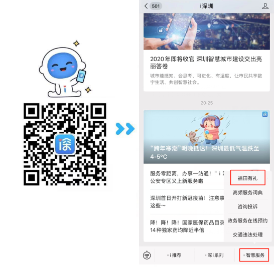 通过“i深圳公众号-智慧服务-福田有礼”,进入“福田有礼”活动专区。