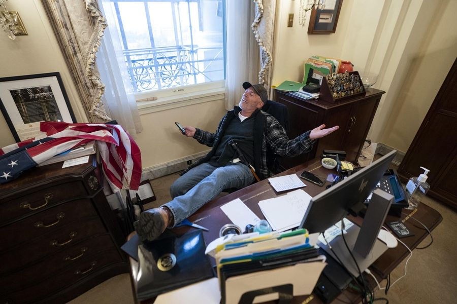 特朗普支持者冲进美国国会,闯入美国众议院议长佩洛西办公室,坐在佩洛西的椅子上。图片来源:东方IC