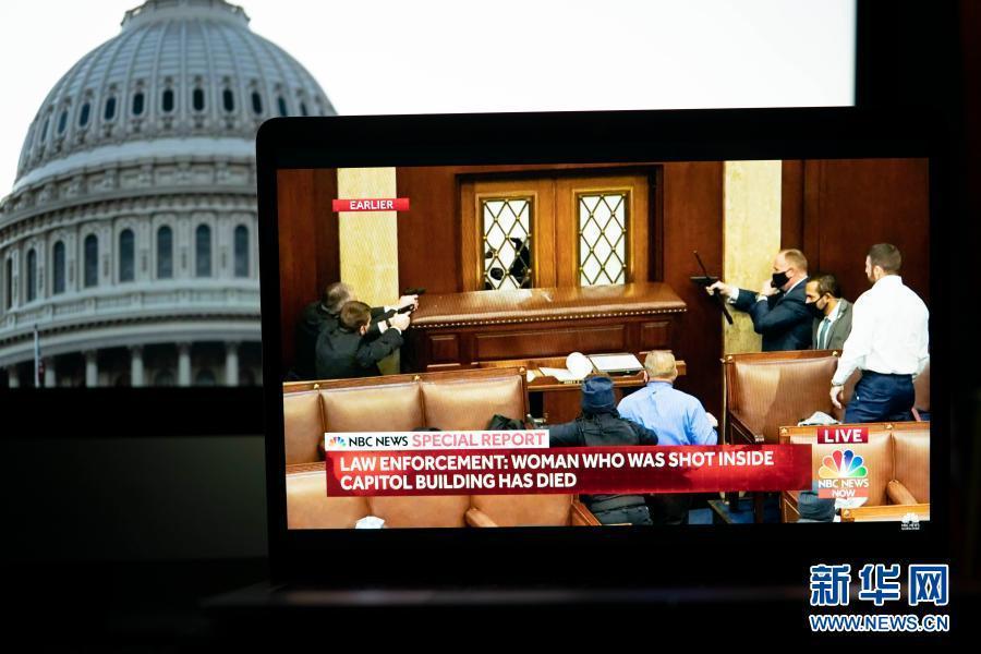 1月6日拍摄的电视画面显示,一名抗议者闯入位于美国华盛顿的国会大厦。新华社记者 刘杰 摄
