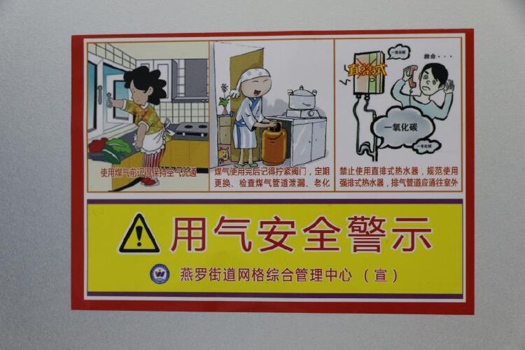 “使用燃气要注意通风,使用完毕要拧紧阀门,定期检查配套设施,禁止使用直排式热水器,强排式热水器排气管应通往室外。”燕罗网格员入户开展用气安全宣传时。顺手将用气安全警示贴张贴在居民厨房、卫生间等重点区域,使居民使用燃气设备时一眼可见,时时提醒居民注意用气安全。