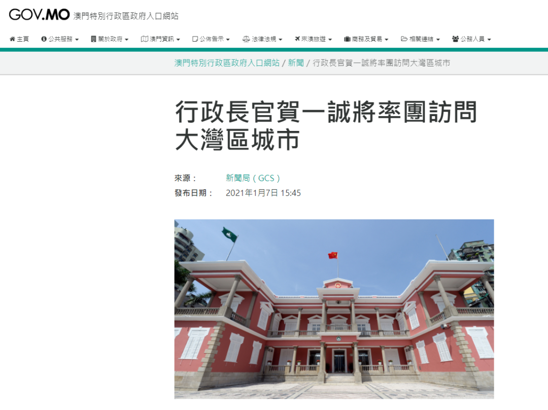 在启程访问之前,澳门特区政府网站发布消息:贺一诚特首本月8日起开始访问粤港澳大湾区各城市,与各市领导会面及考察当地的产业发展项目,进一步深入推进粤港澳大湾区建设工作。