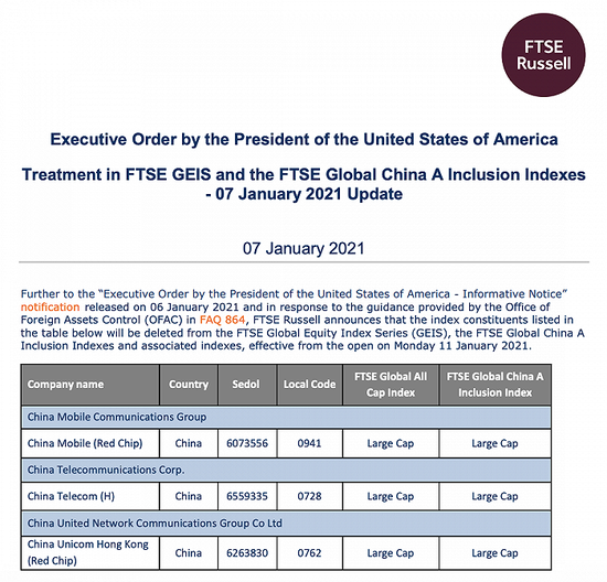 富时罗素1月7日的声明表示,将把中国移动(红筹股)、中国电信(H股)和中国联通香港(红筹股)从富时全球股票指数系列、富时全球含A股指数系列及相关指数中剔除。