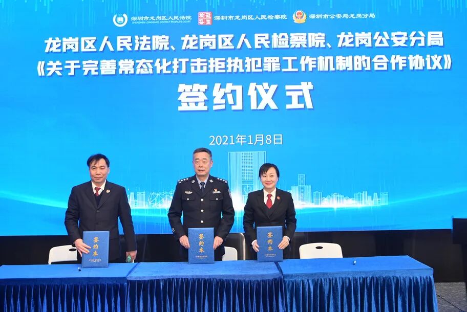 活动中,龙岗区法院与龙岗区检察院、龙岗公安分局、龙岗交警大队等相关单位分别签署了《关于完善常态化打击拒执犯罪工作机制的合作协议》《关于深化执行联动机制建设加强业务常态化合作的协议》《关于布控被执行人机动车辆的合作协议》等联动机制建设文件,各方将在打击拒执犯罪、查找被执行人信息、布控扣押被执行人机动车辆等方面采取一系列更加具体化、精细化、易实操的有力措施。
