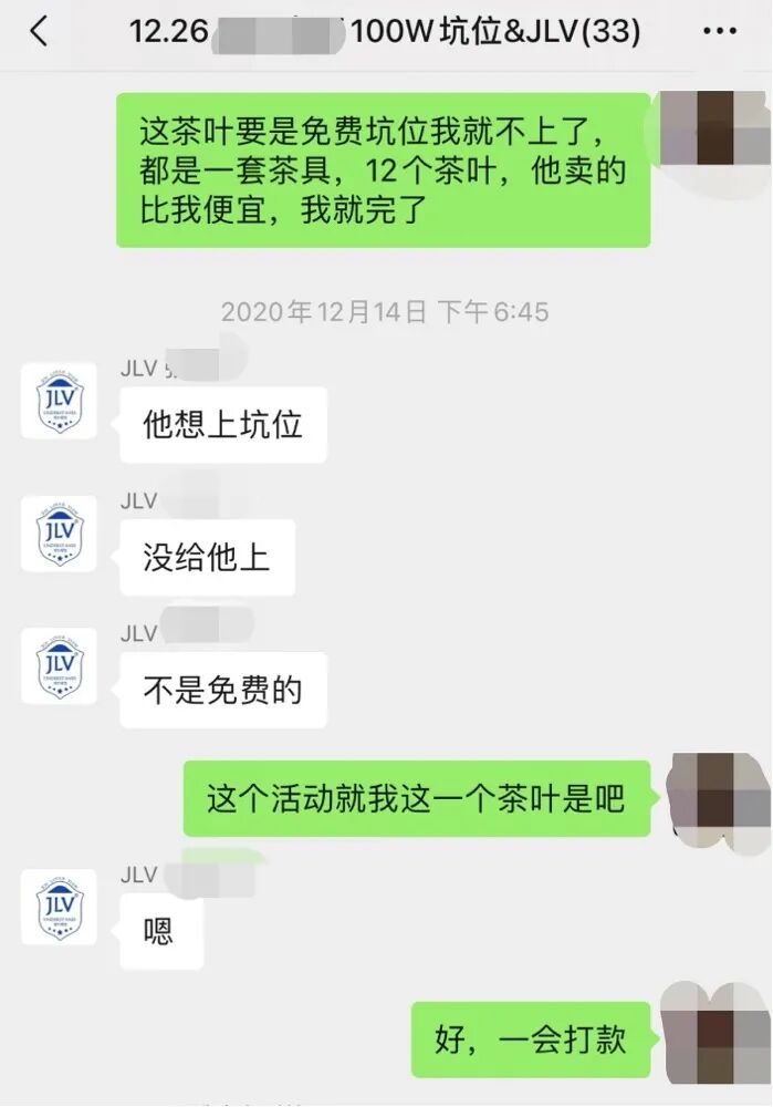 参与了这场直播的商家彭某告诉记者,前期沟通时,与他对接的既有FAN严选的工作人员,也有JLV工作人员,但奇怪的是,最终与他签订合同的主体却只有FAN严选公司。最初,彭某只签了1个商品进直播间,并缴纳了100万坑位费,随后JLV的工作人员找到他,希望可以多签一个商品,“他们打我电话,说这次推1000万元付费流量,活动力度挺大,人气预计能做到200万。”于是彭某又追加了一个茶叶礼盒,坑位费同样是100万元,当时JLV工作人员在微信里承诺,直播期间 “全场只有一个茶叶”产品。