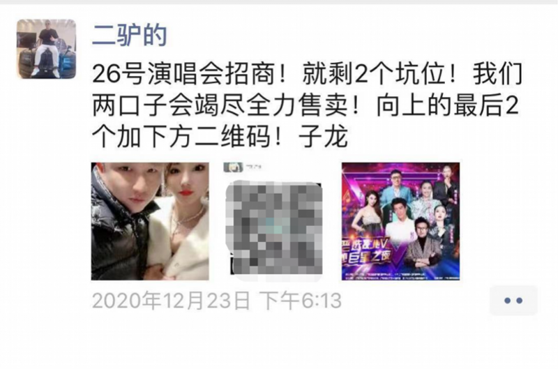 记者从多位商家处了解获悉,12月初,直播电商公司FAN严选和JLV共同对外招商,称要在12月26日举办“海心沙巨星之夜”,现场将邀请王力宏、张柏芝、孟美岐、汪峰等明星到场,并将由二驴和平荣进行直播带货。