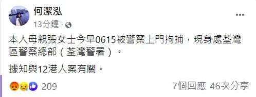另外,前学联副秘书长何洁泓亦在fb发帖称,其母张女士今晨6时许被警察上门拘捕,现身处荃湾警署。