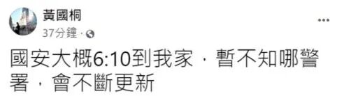 九龙城区议员、律师黄国桐今(14日)早6时23分在Facebook发帖称,6时10分被国安处人员上门带走,暂不知到哪间警署。