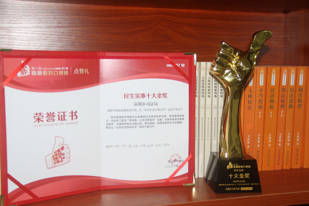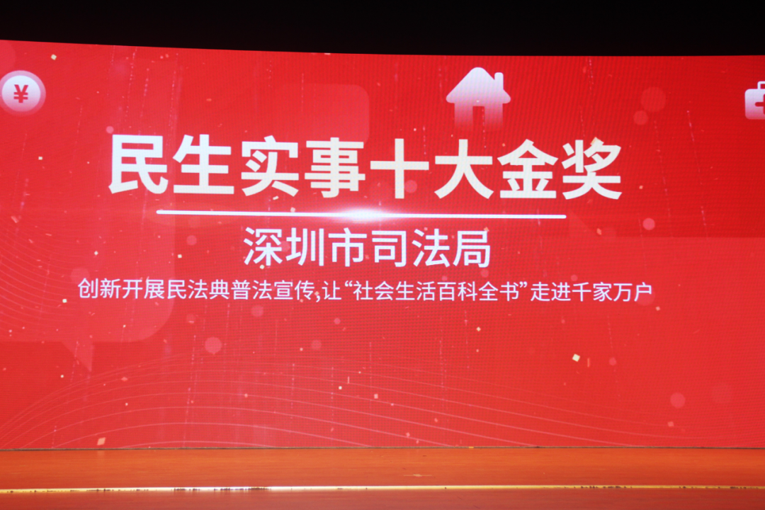 民生实事十大金奖这一奖项,不仅代表了深圳市司法局在组织全市各项《民法典》宣传工作中表现优异,还证明了这些普法工作赢得了广大市民群众的认可,赢得了老百姓的口碑!