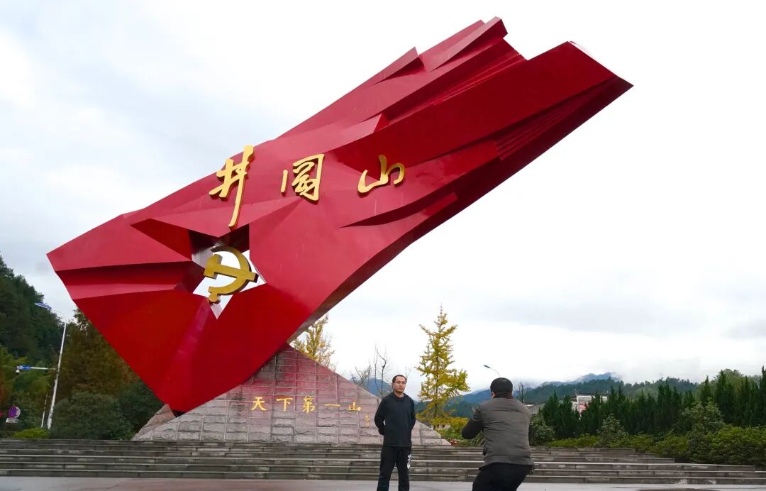 游客在井冈山的“井冈红旗”雕塑前参观留影(2018年11月21日摄)。新华社记者胡晨欢摄