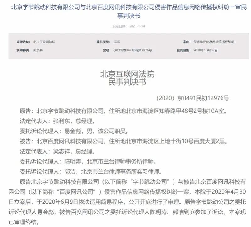 据了解,除了此次赔偿金额40元的案件外,字节跳动和百度还有其他纠纷尚在处理中。