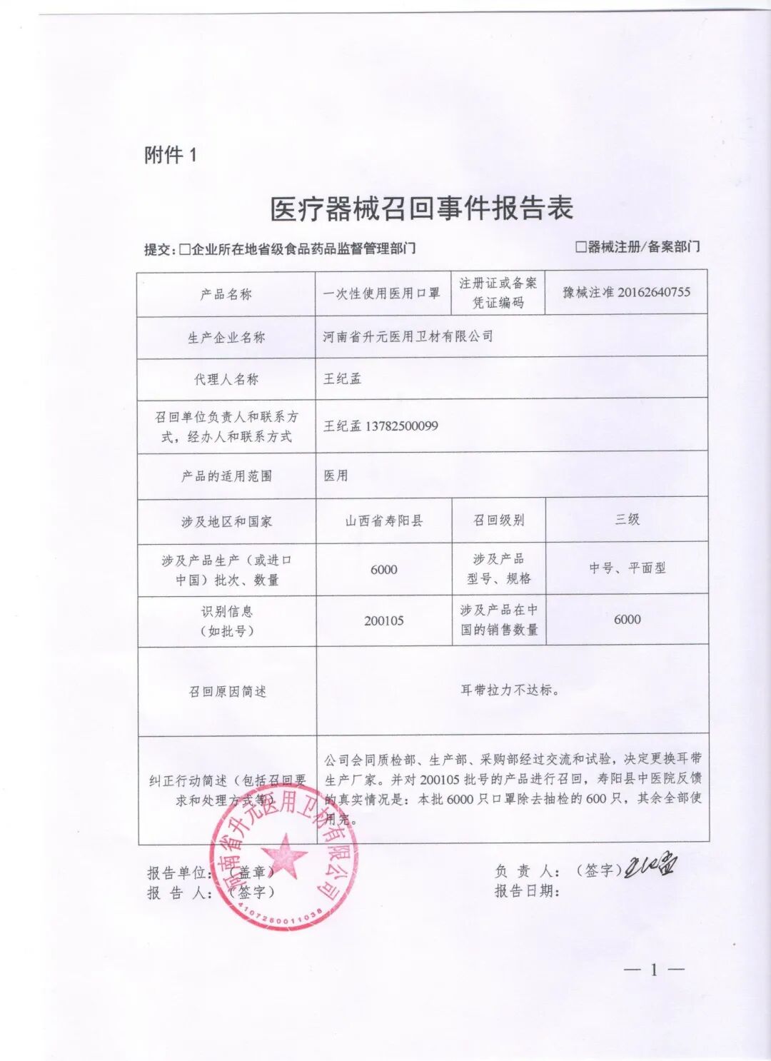 河南省升元医用卫材有限公司报告,由于其生产的一批次一次性使用医用口罩口罩带拉力不符合规定,企业对其主动召回,召回级别为三级。召回产品的型号、规格为平面型、中号;生产批号为200105,数量6000个。
