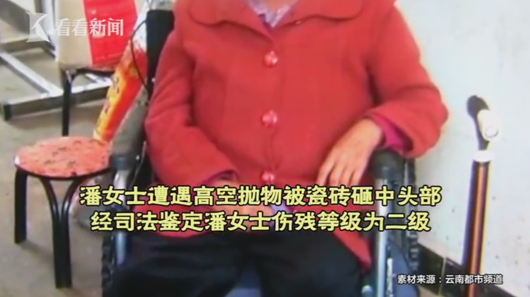 2019年7月31日中午11点,在云南昆明,潘女士和女儿外出回家,刚走到单元楼下,一片巴掌大的瓷砖突然从高空坠下,砸中潘女士头部。