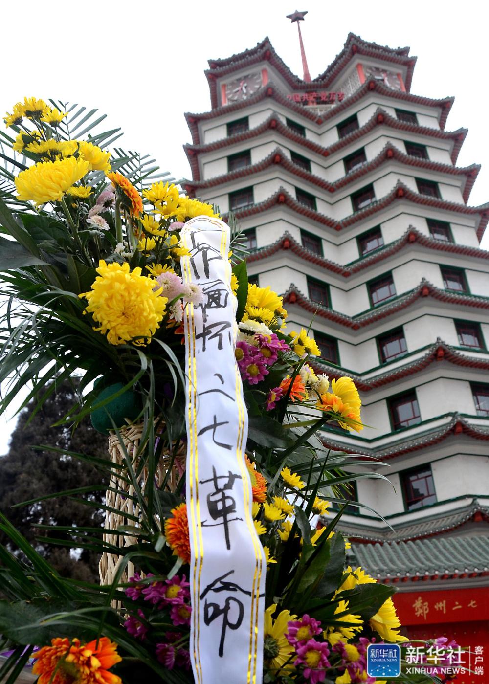 ↑郑州二七纪念塔前摆放着市民送来的花篮(2013年2月7日摄)。新华社记者王颂 摄
