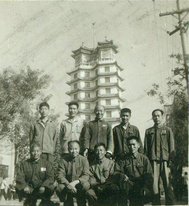 ↑这是翻拍的1971年二七纪念塔部分建设者在塔前的合照(郑州二七纪念馆供图)。