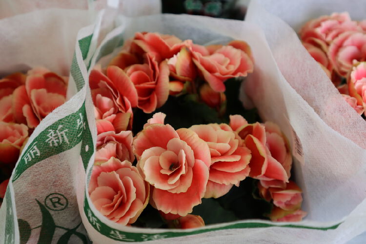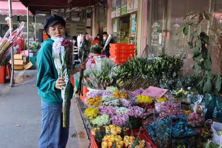 店主正在打包处理自家的花材。