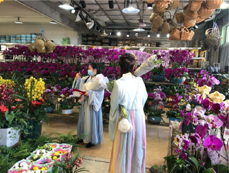 身穿汉服的小姐姐,似乎来到古代的“后花园”。