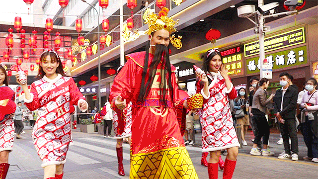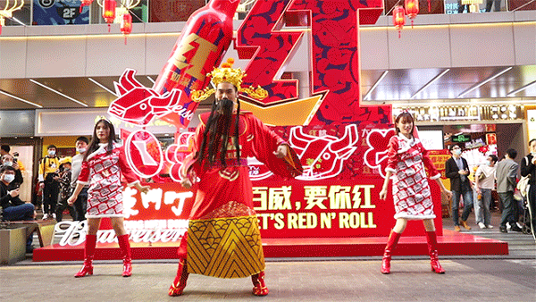 活动现场,百威“财神”手拿满满一筐红包走来,把好运传递给现场的每一个人,还带来了火爆全场的“招财舞”。