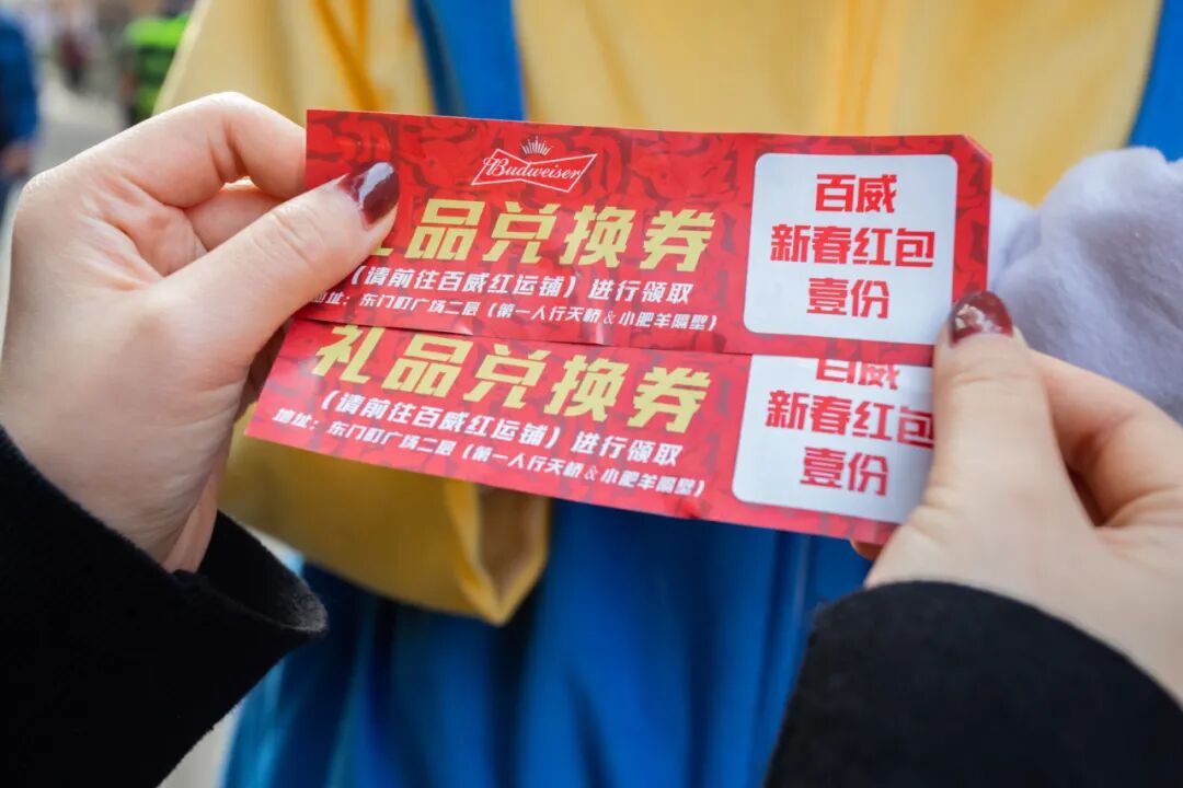 在巡游人偶处获得“百威新春红包”礼品兑换券后,就可以到百威“红”运铺领取百威“定制红包”一份了。