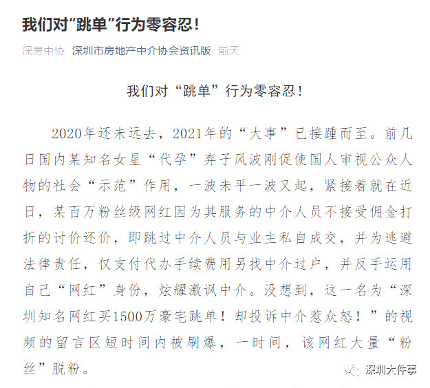 深圳市房地产中介协会:对“跳单”行为零容忍