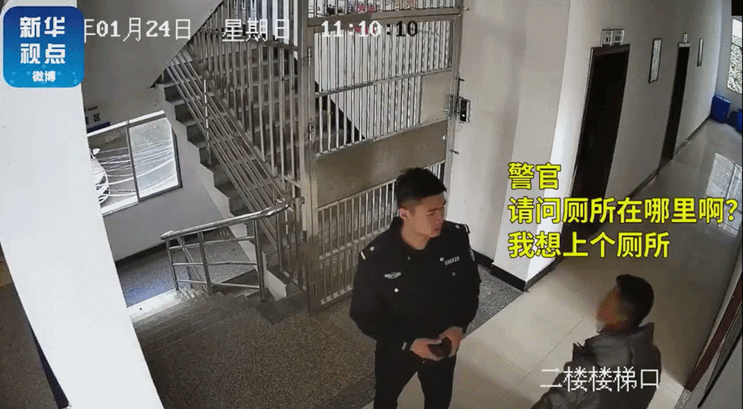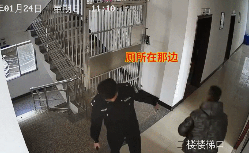 不一会儿,一名民警从食堂吃完午饭回来,他又向民警打听厕所在哪,并往厕所走去……