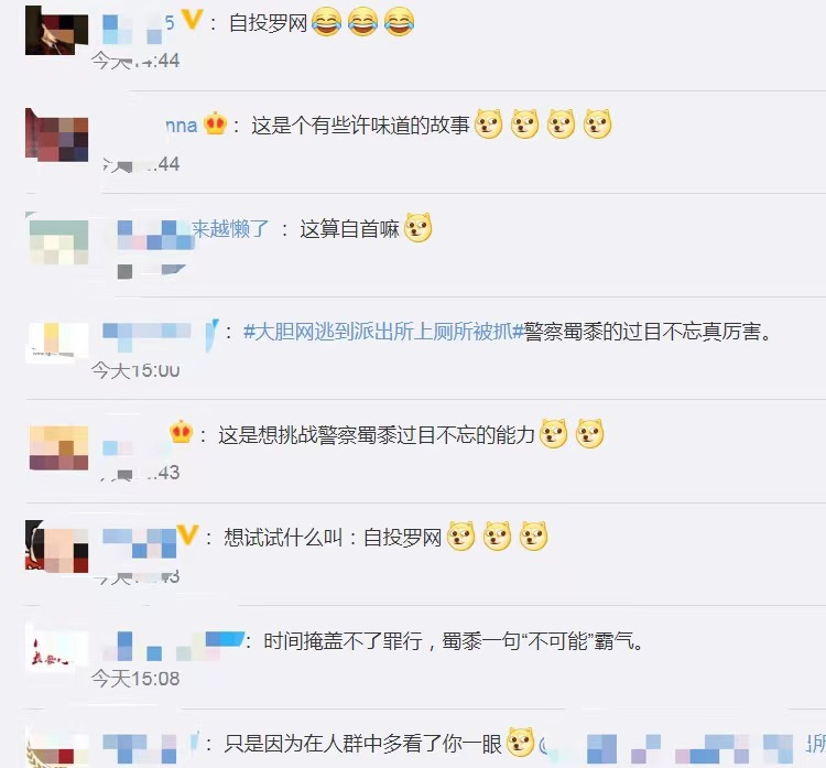 网友评论:“自投罗网。”“只是因为在人群中多看了你一眼。”“警察叔叔过目不忘真厉害!”