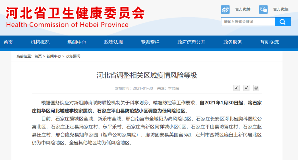 根据国务院应对新冠肺炎联防联控机制关于科学划分、精准防控等工作要求,自2021年1月30日起,将石家庄裕华区河北城建学校家属院,石家庄平山县防疫站小区调整为低风险地区。