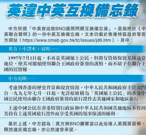 英国宣布,明日起合资格申请BNO的香港人,可以签证入境英国逗留最长5年,之后倘符要求则可申请定居,满1年后可以入籍。中国外交部发言人对此表示强烈愤慨、坚决反对,指英方彻底改变原来中英谅解的BNO性质,严重侵犯中国主权,粗暴干涉香港事务和中国内政,严重违反国际法和国际关系基本准则,同时宣布明日起中国不再承认BNO作为旅行证件及身份证明,并保留采取进一步措施的权利。港府昨也配合同步不再承认BNO,包括不得使用BNO在本港出入境。