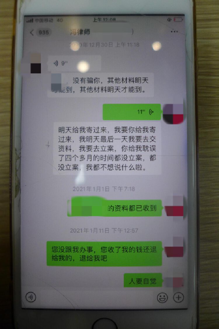 民警罗奇细细查看事主提供的证据后发现,冯某清“律师”身份存疑,“他未向张女士展示过律师执业证书,也并未提过自己在哪个律所工作,只在微信上向另一受害事主王女士发送过一张模糊不清的‘基层法律服务工作者职业资格证书’照片,且证书上的日期已过期。”