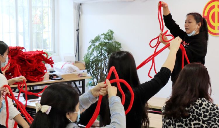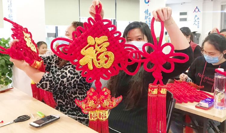 “在中国古代,人们通过结绳来记事,结绳经过多种功能变化,成了今天的吉祥饰品。”手工老师向现场职工娓娓道来中国结的历史背景。现场职工听完手工老师详细讲解的编织方法后,开始进行摆绳、绕绳、打结,最后挂上穗子,贴上“福字”和“年年有鱼”等的饰品。随着一个个中国节的制成,职工们自豪地向手工老师展示成品、拍照留念,现场洋溢着一片喜庆热闹的“年味”。