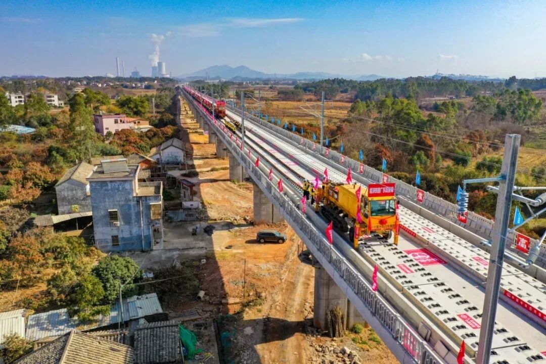 2月1日上午,随着一组500米长轨缓缓铺入赣(州)深(圳)高铁,汕湛高速特大桥无砟轨道板上,标志着赣深高铁广东段正式开始铺轨。