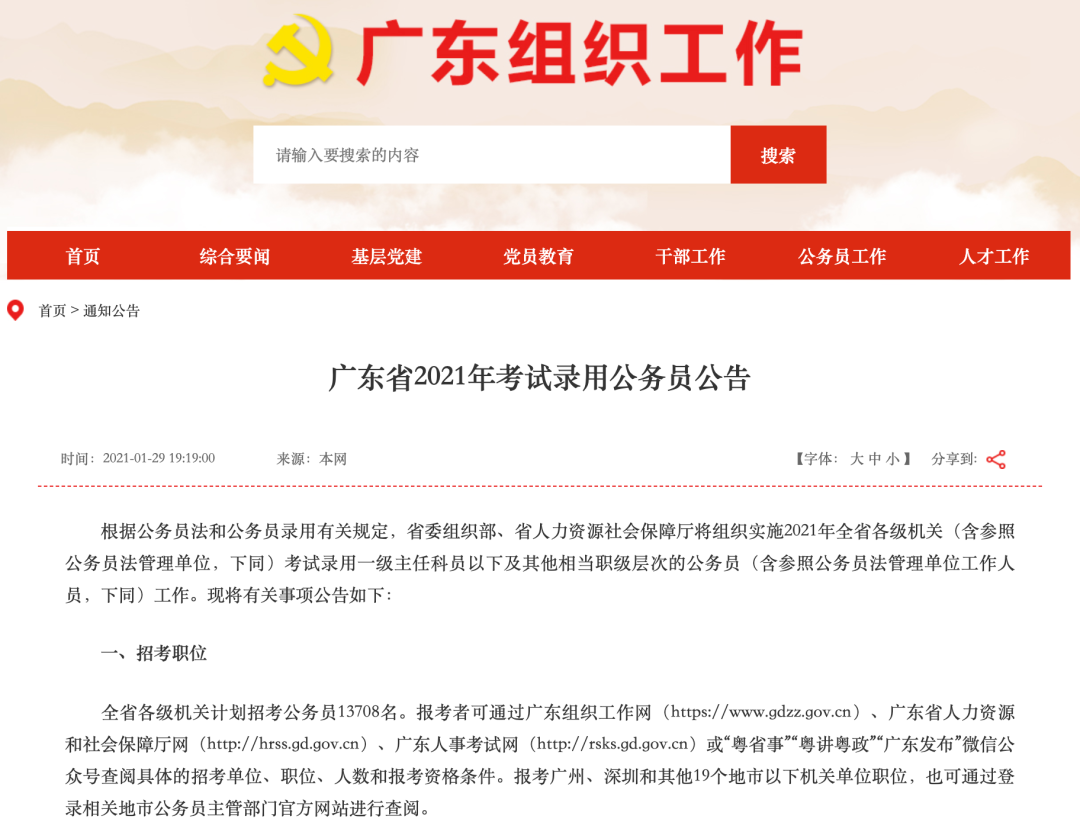 近日,广东省委组织部、广东省人力资源和社会保障厅发布《广东省2021年考试录用公务员公告》,计划招录13708名公务员,其中深圳市罗湖区有2个职位定向港澳人士招录。