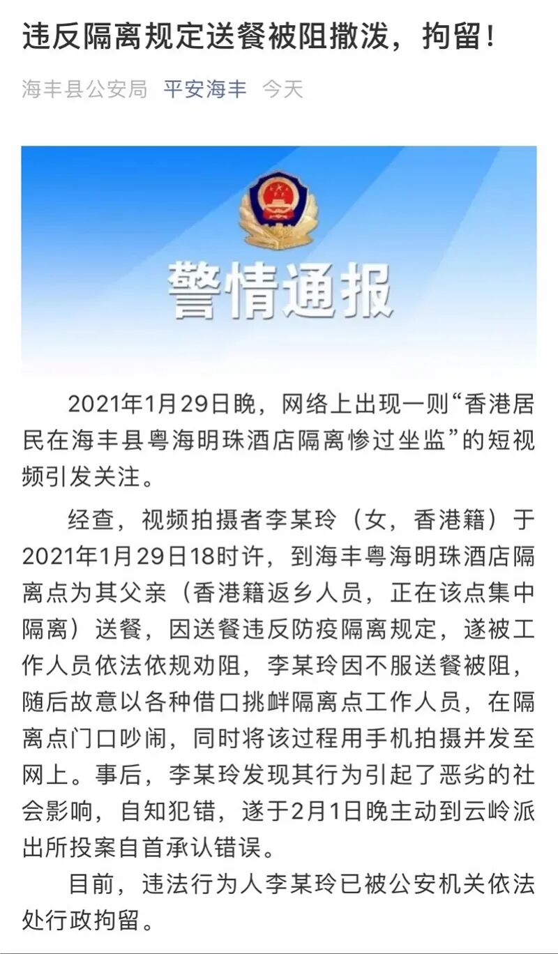 通报称,2021年1月29日睌,网络上出现一则“香港居民在海丰县粤海明珠酒店隔离惨过坐监”的短视频引发关注。