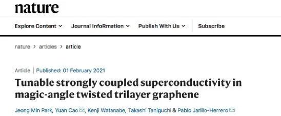 最新在《自然》发表的论文,曹原和Jeong Min Park 为共同第一作者,此外曹原还与他的导师、帕布罗·埃雷罗教授共同担任论文通讯作者。论文指出,三层扭转石墨烯能够表现出超导性。在新的三层结构中,中间一层石墨烯相对于外层以新的角度扭转,其超导性比双层结构更稳定。这个“三明治”比双层的“魔角”石墨烯更加稳定,并且能够通过两种相互独立的方式进行调节。这样的结构或有助于理解实现高温超导需要的条件。