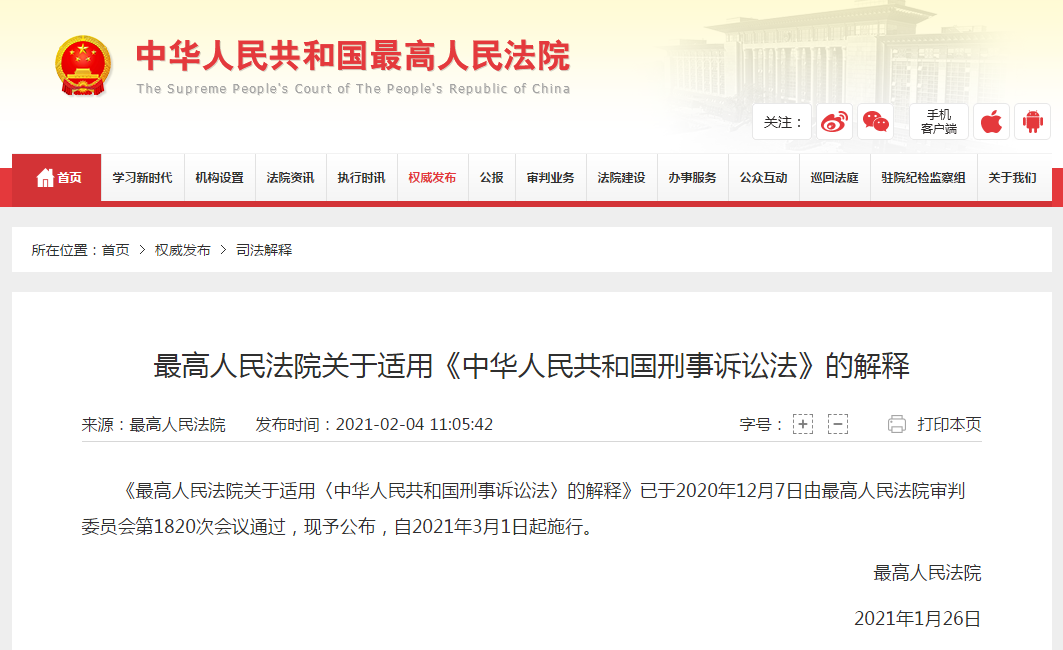 2月4日,最高人民法院发布《最高人民法院关于适用〈中华人民共和国刑事诉讼法〉的解释》(以下简称《新刑诉法解释》)。