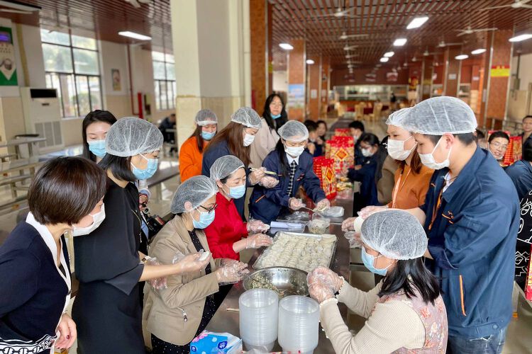 龙岗区劳动就业服务中心负责人与裕同工友一同包饺子。