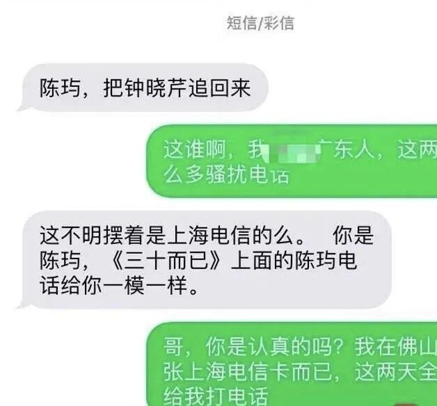 2020年8月,广东陆先生向记者反映,由于自己的手机号码出现在了热播剧《三十而已》的画面中,被观众误以为是剧中一男主的号码,每天会有数百个陌生来电和短信骚扰,甚至持续到凌晨两三点。无数人喊话让他追回前妻“钟晓芹”,令其不堪其扰。