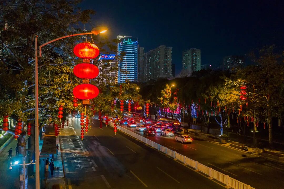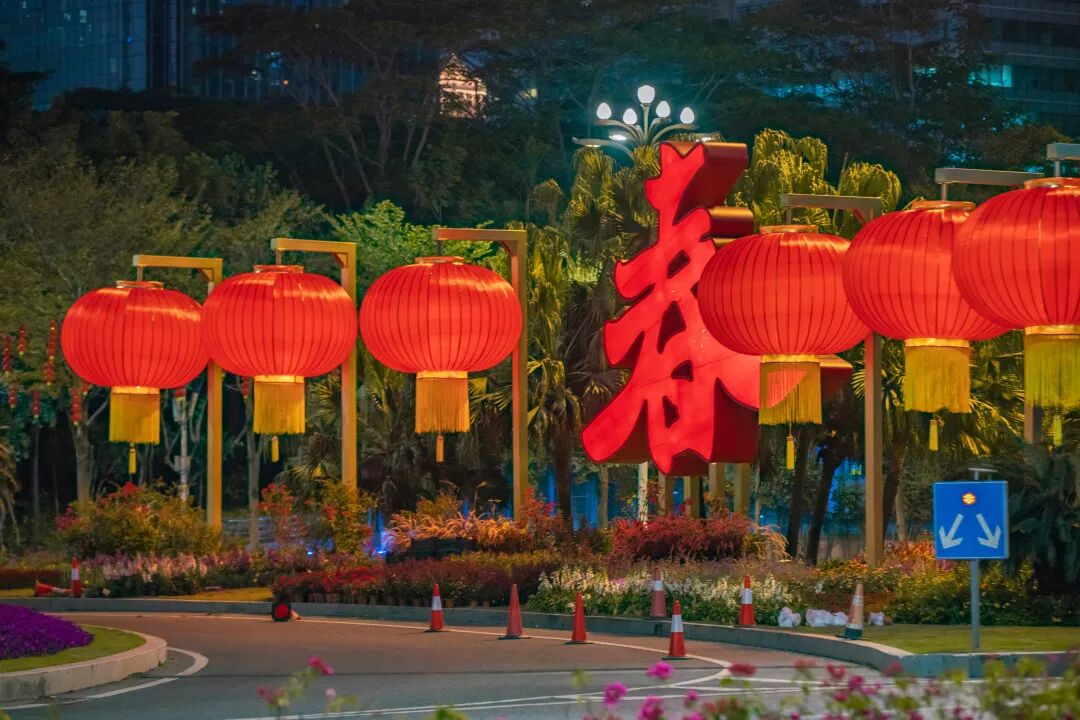为了做好春节氛围营造工作,福田区城市管理和综合执法局连日在城区各大主干道、重要区域等方位悬挂灯笼和红旗,让喜庆的年味“红”遍街头。街面上大串红灯笼连成一抹新年红,描绘出新春佳节的浓厚年味;国旗迎风飘展,书写着和平盛世的安详喜乐。在各大主干道上,目之所及,一片喜气洋洋。白天,红灯笼迎风摇曳,红得透亮,与蓝天、绿树相互映衬,组合成一幅幅热烈喜庆的迎春画面。晚上,红灯笼亮起灯,一列列“闪耀”在空中,点亮城市的夜空,倍增春节的仪式感。