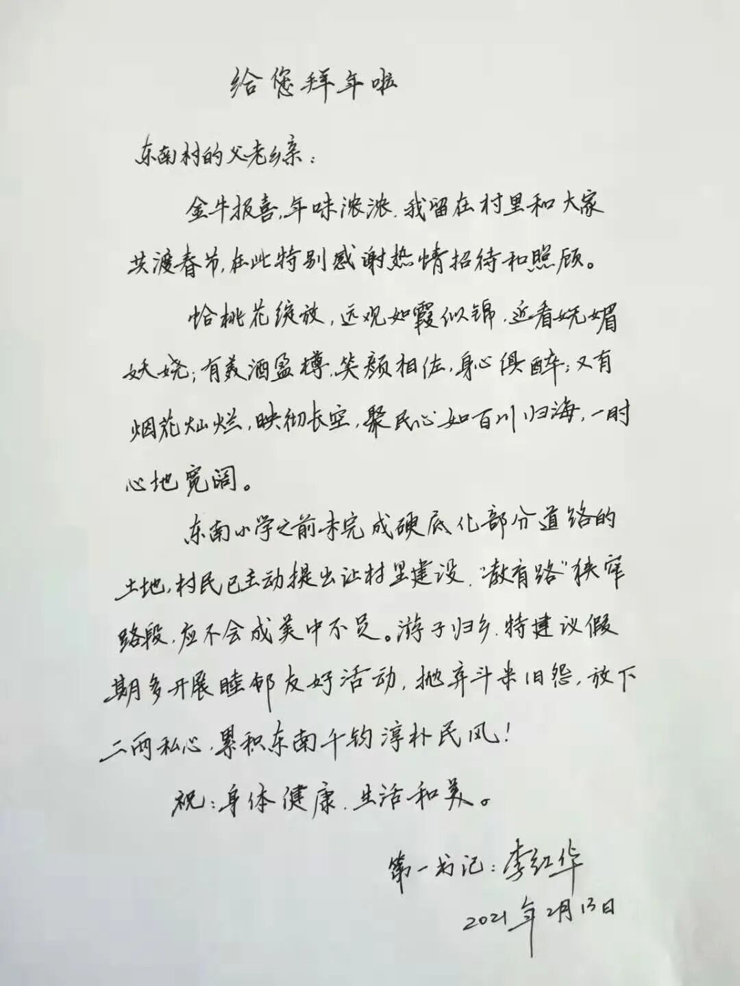 2月13日,大年初二,南山区沙河街道办派驻连平县东南村第一书记李红华在朋友圈发了一封致东南村父老乡亲的拜年信,在东南村村民微信群得到大量转发。
