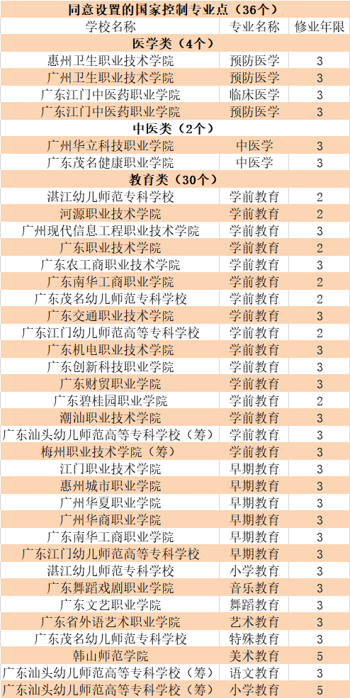 广州卫生职业技术学院、广东茂名健康职业学院、湛江幼儿师范专科学校等广东高校有共36个专业入选。其中教育类专业最多,达30个。