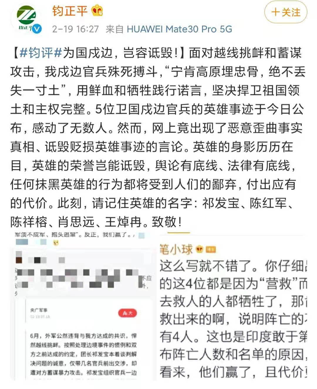 2月19日下午16时27分,钧正平工作室官方微博 @钧正平 发声:面对越线挑衅和蓄谋攻击,我戍边官兵殊死搏斗,“宁肯高原埋忠骨,绝不丢失一寸土”,用鲜血和牺牲践行诺言,坚决捍卫祖国领土和主权完整。5位卫国戍边官兵的英雄事迹于今日公布,感动了无数人。然而,网上竟出现了恶意歪曲事实真相、诋毁贬损英雄事迹的言论。英雄的身影历历在目,英雄的荣誉岂能诋毁,舆论有底线、法律有底线,任何抹黑英雄的行为都将受到人们的鄙弃,付出应有的代价。