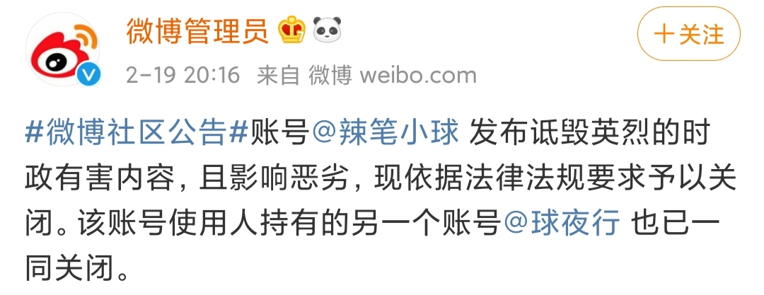 2月19日20时16分,@微博管理员 发布处置后续,称账号@辣笔小球 发布诋毁英烈的时政有害内容,且影响恶劣,现依据法律法规要求予以关闭。该账号使用人持有的另一个账号@球夜行 也已一同关闭。