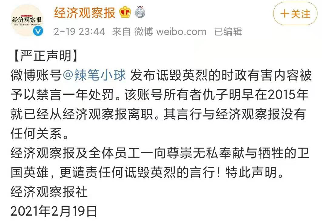 2月19日晚上,@经济观察报社 发严正声明,称微博账号@辣笔小球 发布诋毁英烈的时政有害内容被予以禁言一年处罚。