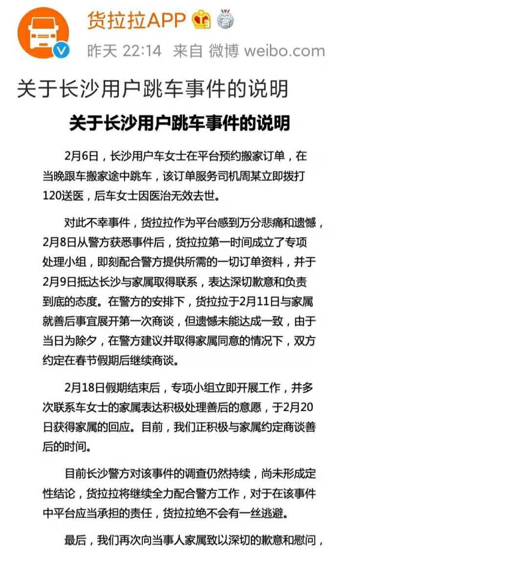 对此,货拉拉在声明中介绍:2月6日,长沙用户车女士在货拉拉平台预约搬家订单,在当晚跟车搬家途中跳车,该订单服务司机周某立即拨打120送医,后车女士因医治无效去世。