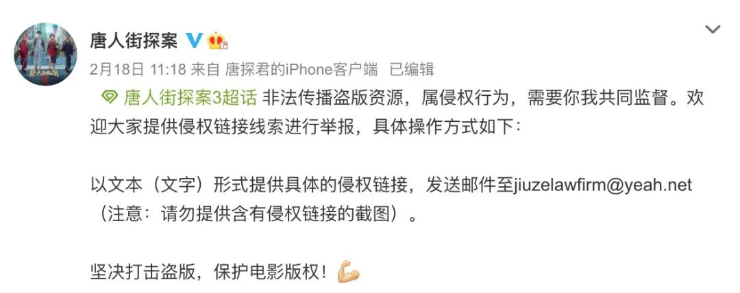 2月18日,电影《唐人街探案》官方微博发布侵权链接线索举报邮箱,呼吁网友坚决打击盗版,保护电影版权。
