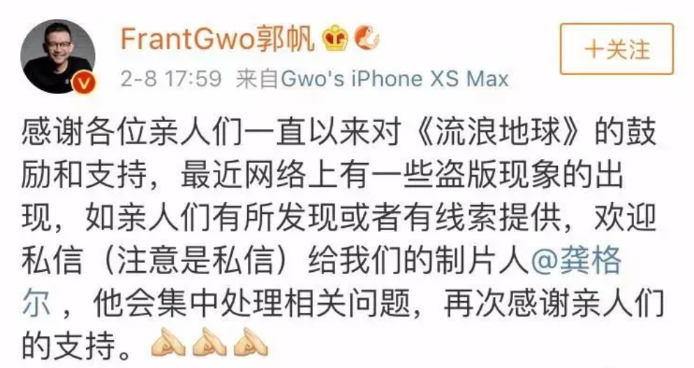 时间回到2019年春节,《流浪地球》的火爆也抵不住导演下场,打击盗版。当时就有网友评论称,一系列泄露已造成“中国电影史上最大泄露事故”。