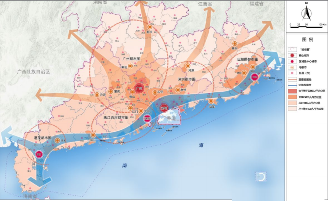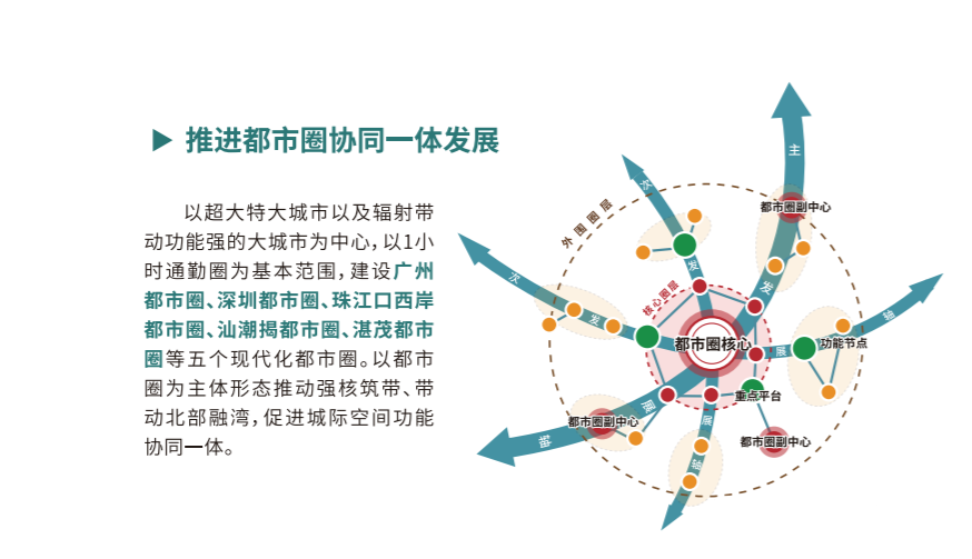 以超大特大城市以及辐射带动功能强的大城市为中心,以1小时通勤圈为基本范围,建设广州都市圈、深圳都市圈、珠江口西岸都市圈、汕潮揭都市圈、湛茂都市圈等5个现代化都市圈。以都市圈为主体形态推动强核筑带、带动北部融湾,促进城际空间功能协同一体。