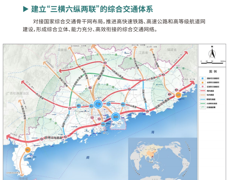 围绕构建“一核一带一区”(一核一带一区分别为:珠三角核心区、沿海经济带、北部生态发展区)区域发展格局,规划提出,上海-汕头-汕尾-深圳-广州、北京-韶关-广州-佛山-珠海-澳门的磁悬浮线路,还有阳江-珠海-深圳高铁(赣深客专西延线)、琼州海峡通道。